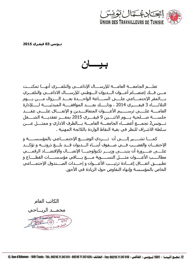 Tunisie (dynamique syndicale) – La Fédération générale de l’ONT (Office national de la télédiffusion), relevant de l’Union des travailleurs de Tunisie (UTT) annonce que le sit-in entamé par les agents de l’office au siège de l’ONT le lundi 2 février, a été stoppé le mardi 3 février 2015 à 13h00.