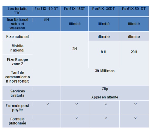 Le client « ForFIX » bénéficie également de plusieurs heures de communication gratuites (3,8 ou bien 20 heures/mois) valables vers les mobiles de tous les opérateurs en Tunisie ainsi que vers les fixes en Europe (France, Grande-Bretagne, Allemagne, Italie, Belgique, Pays-Bas, Espagne, Grèce, Suisse, Suède, et Portugal) et les fixe et mobile de l’Amérique du Nord, comme c’est mentionné dans le tableau ci- dessous :