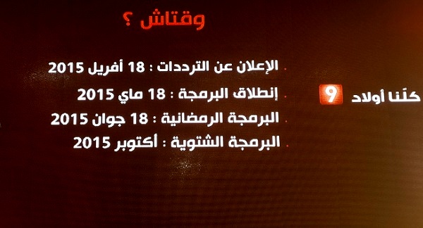 - 9 -Attessia-Moez Ben Gharbia lance sa chaine TV sous le slogan-Kolna Ouled Tessaâ -hhhhL’objectif de Moez Ben Gharbia était d’annoncer le lancement officiel de sa chaîne de télévision 9 (Attassiâ) qui démarrait le jour même avec la diffusion d’une bande-annonce-choc et donner un aperçu de sa ligne éditoriale et les grandes lignes de sa programmation qui démarrera effectivement le 18 mai 2015 sur la fréquence : Nilesat 11.393 Verticale 27.500.