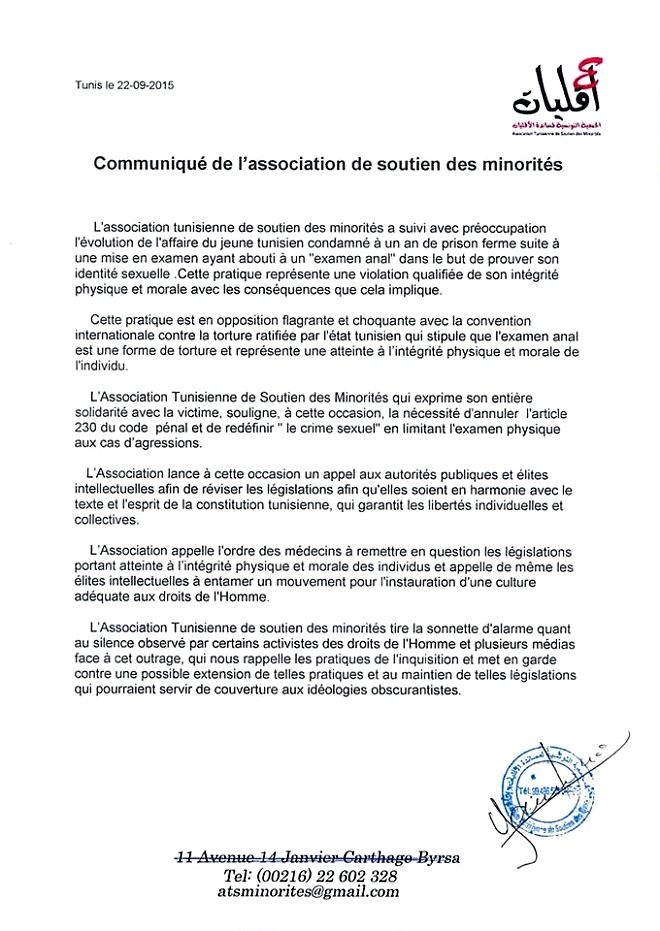 L’Association tunisienne de soutien des minorités s’est également exprimée contre cette pratique qui est « en opposition flagrante et choquante avec la convention internationale contre la torture ratifiée par l’état tunisien qui stipule que l’examen anal est une forme de torture et représente une atteinte à l’intégrité physique et morale de l’individu ».