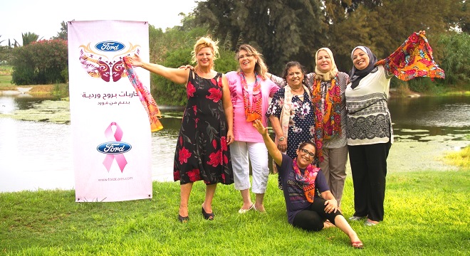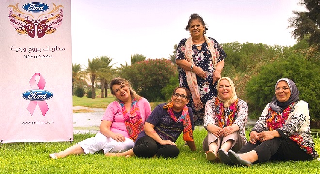 La campagne « Combattantes en Rose », organisée par le bureau de Ford au Moyen-Orient et au Nord de l’Afrique, est arrivée en Tunisie cherchant à sensibiliser les femmes Tunisiennes sur la question du cancer du sein. Cinq femmes combattantes de l’association des malades du cancer ; Madame Bessrour Nadia ; Madame Cherni Monjia ; Mademoiselle Ben Rezgui Chedia ; Madame Ben Mustpha Safia et Madame Kessis Fatma ont participé à la campagne « Combattantes en Rose » pour cette année. La séance photo s’est tenue, Au Golfe de la Soukra, en exposant la collection de vêtements et d’accessoires « Combattantes en Rose » pour mettre en exergue la persévérance, le courage et l’espoir.