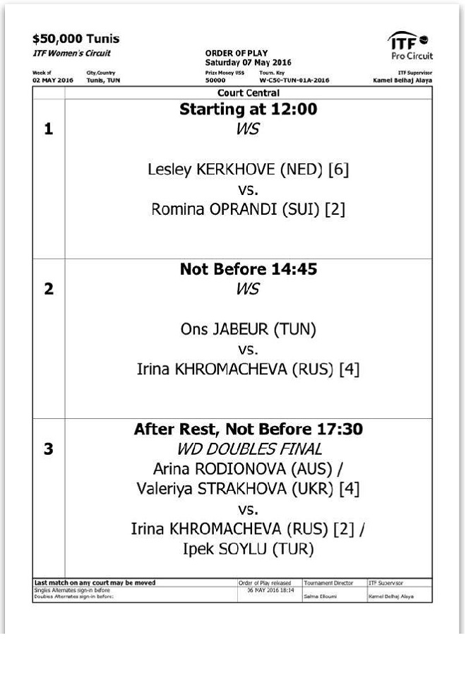 Ons Jabeur, affrontera ainsi, aujourd’hui, samedi 7 mai 2016, à partir de 14h45 sur le court central du tennis club de Tunis, la Russe Irina Khromacheva. Tête de série N°4 et 157e mondiale, qui venait d’éliminer en deux sets la Française Myrtille Georges, tête de série N°8.