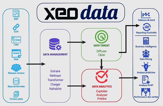Baptisé Xeodata, l’outil éponyme de la société est un puissant Datamart capable, par ses trois composantes Data Management, Data Target et Data Analytics, d’agréger de nombreux flux de données pour les croiser, les analyser et les exploiter dans des actions marketing efficaces.