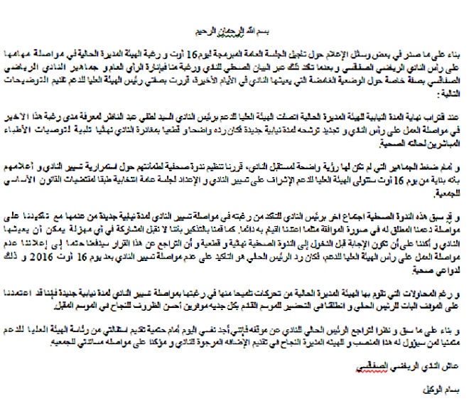 Et ce, alors qu’il était convenu qu’il allait prendre les rênes du club jusqu’à la prochaine assemblée, à cause du départ de Lotfi Abdennadher pour raison de santé.