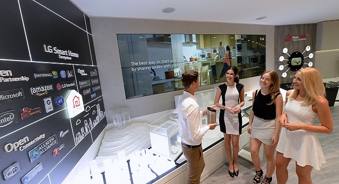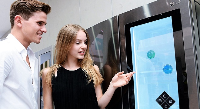 Comme exemple de sa smart technologie pour les tous les jours, LG a fait la démonstration de son réfrigérateur intelligent InstaView porte – à – porte (Door-in-Door™ ) équipé d'un écran LCD tactile transparent de 29 pouces à l'IFA. Alimenté par le processeur Intel® Compute Stick, d'un ordinateur minuscule avec un processeur Intel AtomTM, ce réfrigérateur peut être utilisé aussi bien comme un moniteur mais également une fenêtre pour voir à l'intérieur du réfrigérateur sans ouvrir la porte à l'aide de Knock -On, ce qui rend l'écran transparent avec seulement deux tapes.