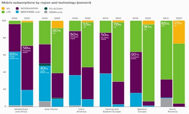 L’Asie-Pacifique sera la deuxième région du monde à enregistrer la plus forte croissance d’abonnements 5G, représentant 10 % en 2022. Entre 2016 et 2022, le Moyen-Orient et l’Afrique connaîtront une évolution considérable, dans une région où la majorité des abonnements porte aujourd’hui sur des connexions GSM/EDGE, pour devenir une région où 80 % de tous les abonnements concerneront des réseaux WCDMA/HSPA et LTE.