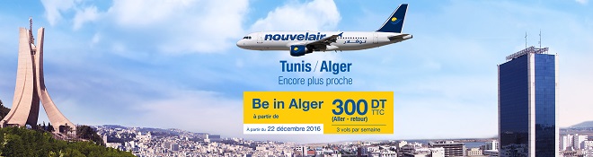 Tunisie-Tribune (Alger la blanche avec nouvelair) – Nouvelair, la première compagnie aérienne privée tunisienne, vient de lancer au départ de Tunis une promotion hivernale exceptionnelle sur Alger à partir de 300 DT TTC en aller-retour.