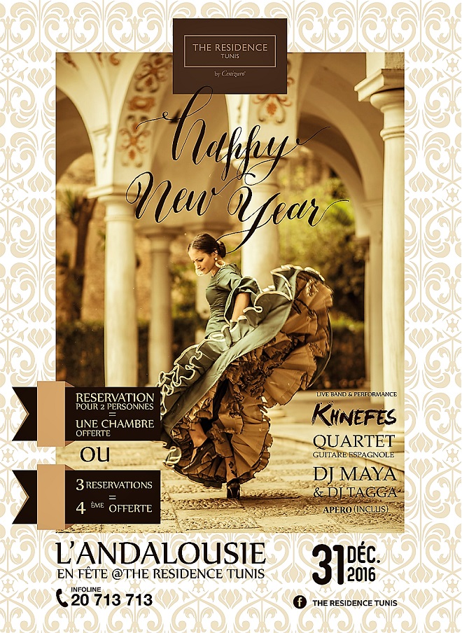 Mais c’est aussi la soirée du 31 décembre à l’hôtel The Residence qui retient actuellement toute l’attention. Fidèle à ses habitudes, l’hôtel organise, pour le réveillon, une soirée à thème qui sera placée sous le signe de l’Espagne en général et de l’Andalousie en particulier. Elle débutera par un open-bar au lobby de l’hôtel pour ensuite se déplacer à la Ballroom Chichkhan.