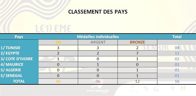 Cette troisième journée a été également marquée par une nette domination tunisienne en obtenant les deux titres mis en jeu. Une domination remarquablement acquise au sabre masculin avec trois tireurs sur le podium. Fares ferjani a réussi à conserver son titre conquis l’année dernière à Alger face à son compatriote Hichem Samandi vainqueur de la médaille d’argent alors que Iheb ben Chaabane a pris le bronze.