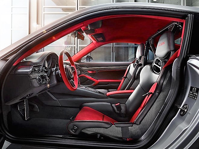 De série, l’habitacle de la 911 GT2 RS est dominé par l’Alcantara rouge et le cuir noir, rehaussés d’éléments en finition carbone. Son volant sport avec palettes de commande permet de passer les vitesses rapidement avec une touche sportive. Le conducteur et le passager peuvent apprécier les qualités dynamiques de la voiture dans des sièges baquets en finition carbone. Comme dans toutes les 911, le Porsche Communication Management (PCM) sert de commande centrale pour le système audio et les fonctions de navigation et de communication. Le module Connect Plus fait également partie de la dotation de série.