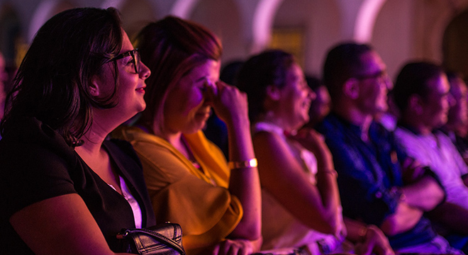 C’est dans un cadre magique et féerique que Zeineb El Melki, animatrice à IFM et directrice de la 1re édition du festival Juste Rire a ouvert la deuxième saison du festival. Juste Zgary a enchainé par un stand-up de folie. D’ailleurs, les éclats de rire et la bonne humeur du public venu en masse remplissaient le somptueux palais d’Ennejma Ezzahra.