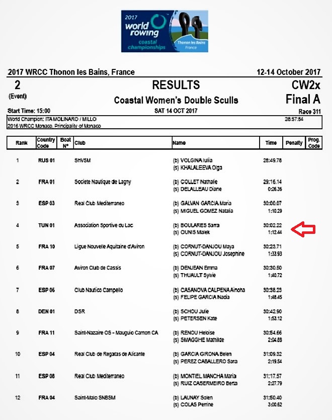 Tunisie-Tribune (Championnat du monde d’Aviron de mer 2017) – au championnat du monde d’aviron de mer organisé cette année, par la fédération internationale d’aviron à Thonon-les-Bains, en Haute-Savoie, France, et ce, du 13 au 15 octobre 2017, les Tunisiennes Sarra Boulares et Malek Ounis se classent au 4ème rang mondial.