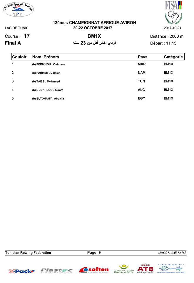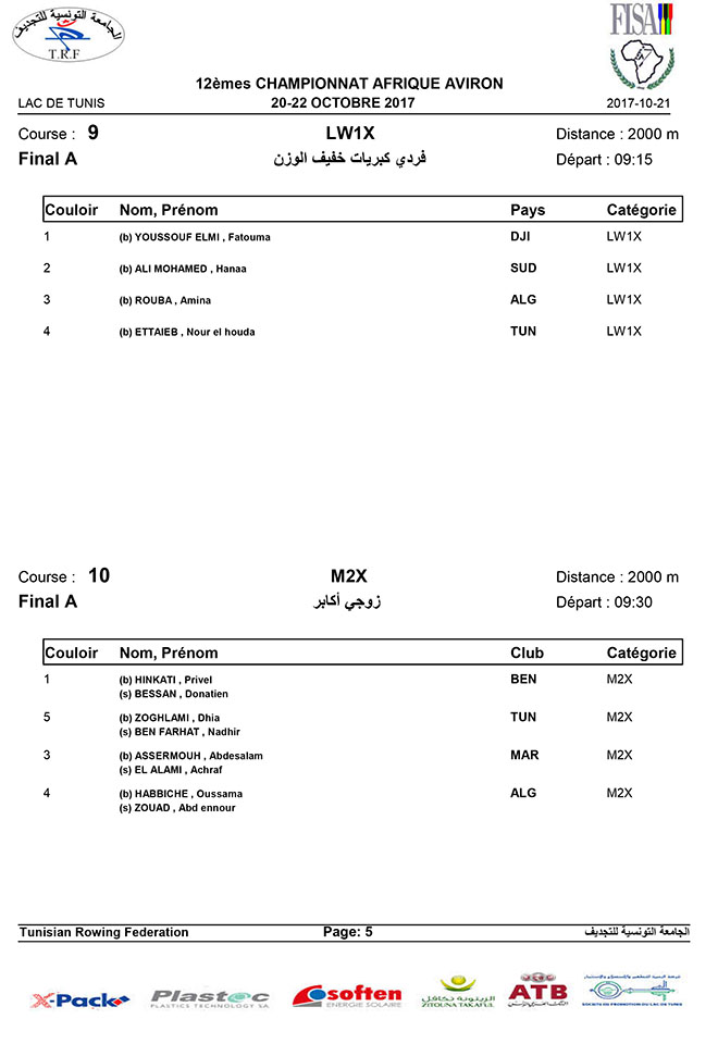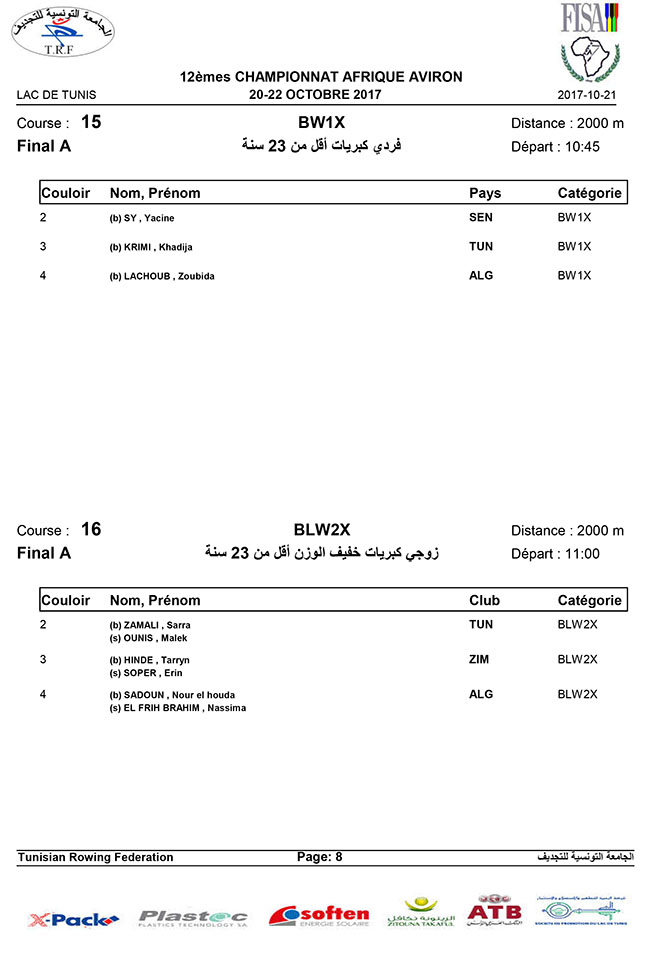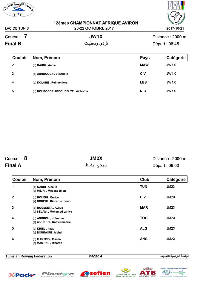 Tunisie-Tribune (Aviron) – voiçi la liste des départs des courses finales du Samedi relatives aux Championnats d’Afrique d’Aviron