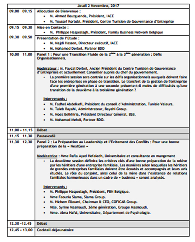 Tunisie-Tribune (5e Forum de la Gouvernance) – L’IACE, en collaboration avec BDO Tunisie, organise la 5ème édition du Forum de la Gouvernance, sous le thème «Préparer le Passage de la 2ème à la 3ème Génération des Entreprises Familiales Tunisiennes», et ce le jeudi 02 Novembre 2017 à la Maison de l’Entreprise, siège de l’IACE.