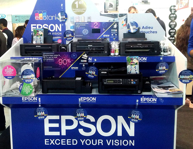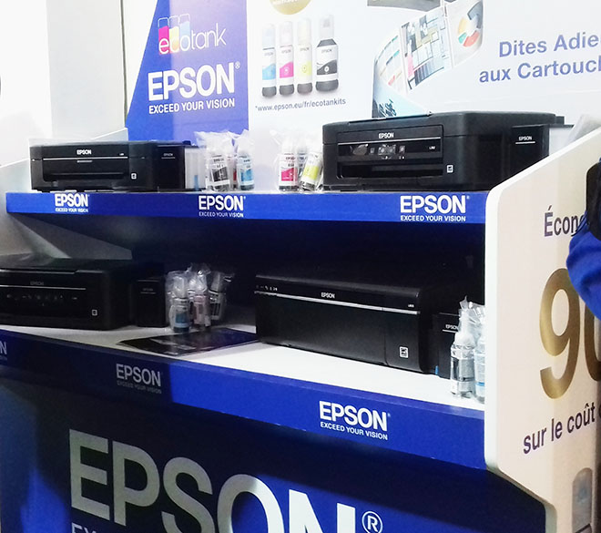 Les stands des revendeurs partenaires d’Epson ont été enrichis, tout au long du salon, par la présentation de la large gamme d’imprimantes et multifonctions EcoTank ITS, composée d’Imprimantes et multifonctions bureautiques (M100/M105, M200, L1300, L1455, L565, L605, L655), d’Imprimantes photo (L805, L810, L850, L1800), et d’Imprimantes et multifonctions destinées aux particuliers (L120, L310, L382, L386, L486). Ces EcoTank ITS offrent aux utilisateurs la vitesse, la qualité et la fiabilité à toute épreuve.