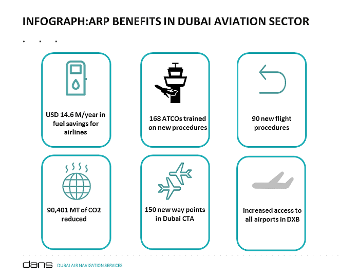 The Air Space Restructuring (ARP) project aims at delivering crucial benefits to the aviation sector in the UAE at large, such as the enhancement of the airspace capacity to meet the forecasted air traffic demand for 2020 and beyond, and increasing access to all airports within the country. In the Dubai Aviation sector in particular, the project deliverables cascade into specific transformational results on annual basis such as enabling airlines to save fuel consumption of a total value of USD 14.6 million, driving CO2 emission reductions of 90,401 metric tons, furthermore enhancing air traffic movements capacity to accommodate continuous growth in the Controlled Airspace for Dubai and the Northern Emirates.