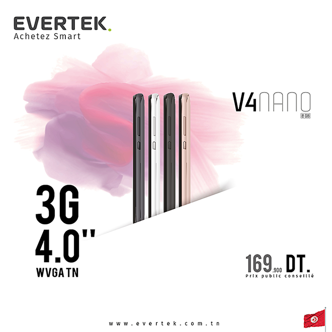 Tunisie-Tribune (Evertek) – Innovation après innovation, la marque Evertek ne cessera jamais de nous surprendre. C’est avec son tout nouveau Smartphone, qu’elle a baptisée V4 Nano, que la marque tunisienne vient donner un sang neuf à sa gamme de téléphone.