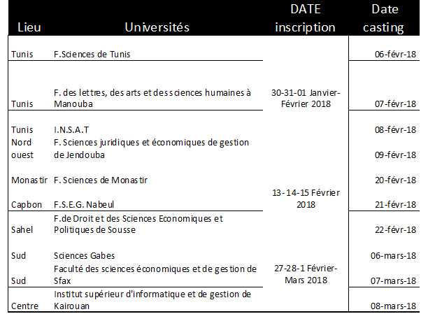 C’est pour cela que le jury habituel, devenu aujourd’hui largement répandu et attendu au niveau des institutions universitaires, composé des fidèles et indéfectibles JaâfarGuesmi, Naïma El Jeni, Sahbi Omar et AssemBettouhami, lesquels prendront leur bâton de pèlerin pour sillonner les universités de Tunis, du Nord-Ouest, de Monastir, du Sahel et du Cap Bon, à partir de la fin de ce mois (voir tableau ci-après), afin de déceler les futurs talents de la comédie et du One man SHOW.