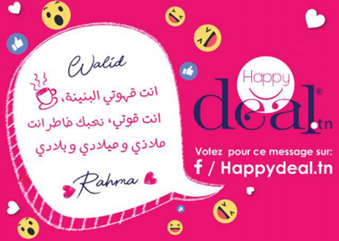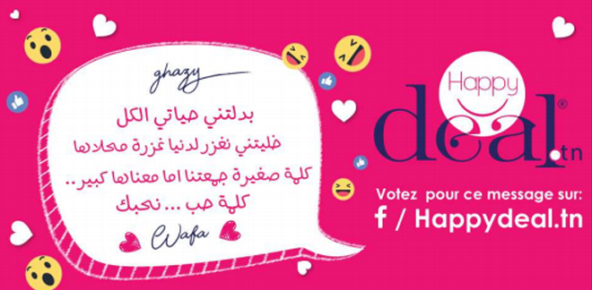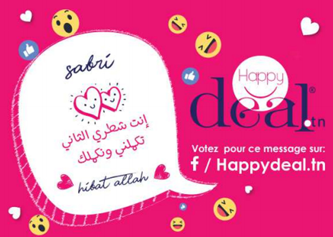 Le site « Happydeal.tn» recueille les déclarations et suite à unemodération minutieuse, les messages les plus originaux et créatifs sont affichés sur le grand Tunis. Suite à quoi les tunisiens choisiront les 3 plus originaux à récompenser.