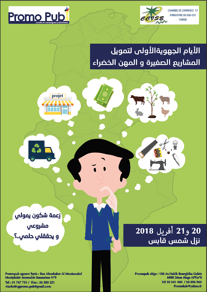 Le sud tunisien, devenue en déca des normes de développement jusqu’à nos jours, malgré les potentialités dont il regorge, d’où l’initiative de notre agence de communication et d’évènementiel, PROMOPUB basée à Gabes, d’organiser les premières journées régionales de la micro finance et des métiers verts, les 20 et 21 avril 2018 à l’hôtel SHEMS à Gabes. Avec le précieux concours de nos partenaires : les opérateurs tunisiens de la micro finance et les métiers verts.