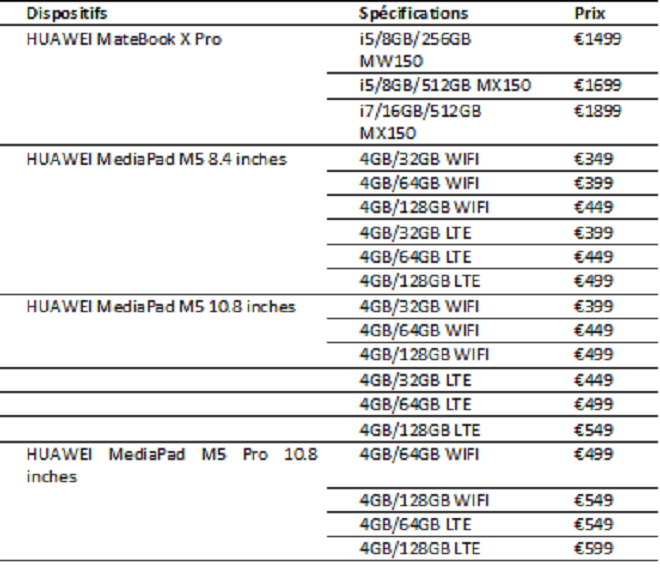 Le HUAWEI MateBook X Pro et le HUAWEI MediaPad M5 Series seront disponibles au printemps 2018 en Chine, en Europe, en Amérique du Nord, en Asie Pacifique et au Moyen-Orient.