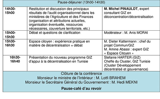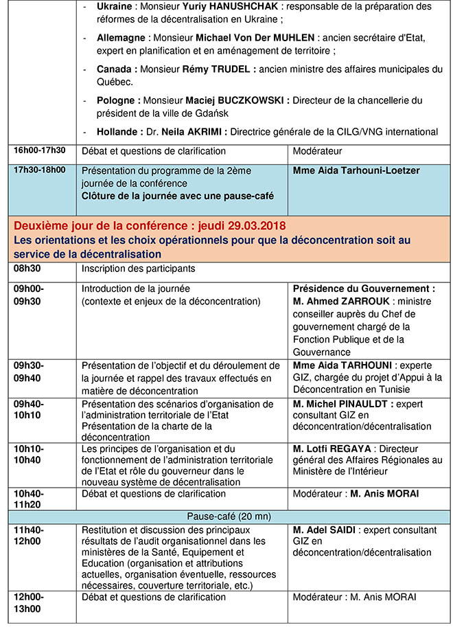 Cadre et motifs d’organisation de cette conférence internationale : Cette conférence internationale s’inscrit dans le cadre du projet tuniso-allemand « Appui à la déconcentration en Tunisie », mis en œuvre conjointement avec la Présidence du Gouvernement, le ministère de l’Intérieur et la Coopération Allemande pour le