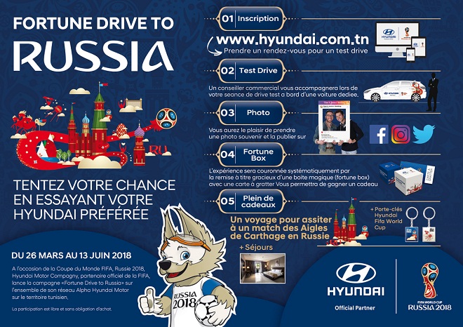 Tunisie-Tribune – La société Alpha Hyundai Motor, distributeur officiel de la firme automobile sud-coréenne Hyundai en Tunisie pour les véhicules particuliers, lance, en collaboration avec Hyundai Motor Company, partenaire officiel de la FIFA, la campagne « Fortune Drive to Russia » à l’occasion de la Coupe du Monde FIFA, Russie 2018™. La campagne est un jeu promotionnel ouvert et sans obligation d’achat.