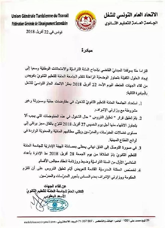 Tunisie-Tribune (Education – Lassaad Yakoubi) – C’est toujours l’impasse après la réunion sectorielle organisée au siège de l’Union Générale Tunisienne du Travail (UGTT) l’après-midi du samedi 21 avril 2018. Lassaad Yakoubi, secrétaire général de la Fédération générale de l’enseignement secondaire, a déclaré aux médias que la crise entre le gouvernement et l’UGTT dépasse le seul secteur de l’enseignement secondaire.