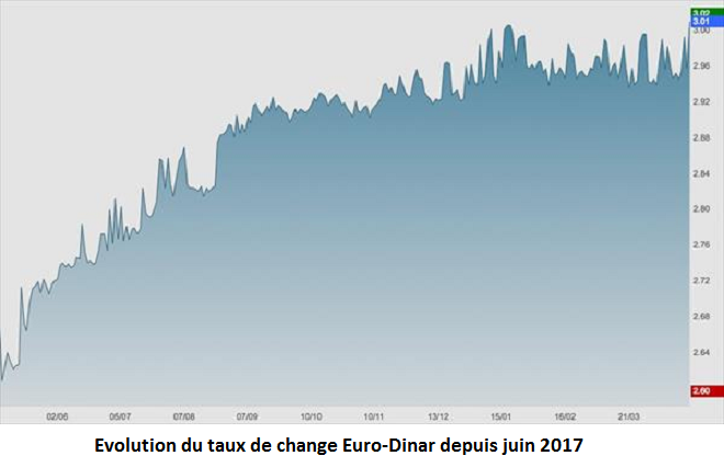 Tunisie-Tribune (L’euro) – Selon les données de la Banque Centrale de Tunisie (BCT), l’euro a dépassé lors de la séance du 27 avril 2018, la barre des 3 dinars. Compte tenu du volume des importations européennes en Tunisie, cette hausse de l’euro face au dinar risque de faire mal au pouvoir d’achat, déjà chancelant, du citoyen Tunisien.