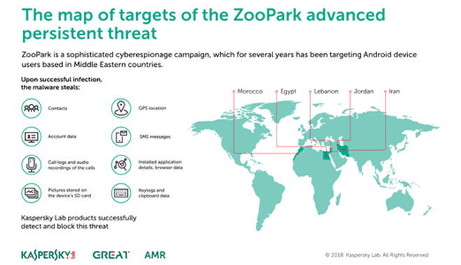 «Les utilisateurs sont de plus en plus nombreux à se servir de leur mobile comme principal voire unique moyen de communication. Or cette tendance n’est certainement pas passée inaperçue aux yeux des acteurs malveillants étatiques, qui développent leur arsenal afin de le rendre suffisamment efficace pour pister les utilisateurs mobiles. La menace persistante avancée (APT) ZooPark, qui espionne activement des cibles dans des pays du Moyen-Orient, en est un exemple mais il n’est sans doute pas isolé», commente Alexey Firsh, expert en sécurité chez Kaspersky Lab.