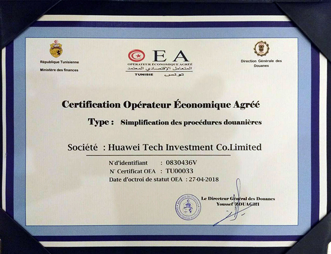 Tunisie-Tribune – Huawei Tech Investment Co Limited, leader international dans le domaine des TIC (Technologies de l’Information et de la Communication), a obtenu le 27 avril 2018 le statut d’Opérateur Economique Agréé (OEA).