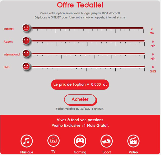 Promo de bienvenue : Pour toute acquisition ou migration vers l’offre Tedallel, Ooredoo offre un accès gratuit à l’ensemble de ses services à contenu. Qu’ils soient mélomanes, cinéphiles, gamers ou amateurs de sports ou de VOD, tous les abonnés trouveront leur bonheur grâce à une multitude de services tels que Mixtape, Mobile TV, Straz Play Xtreme ou CR7.