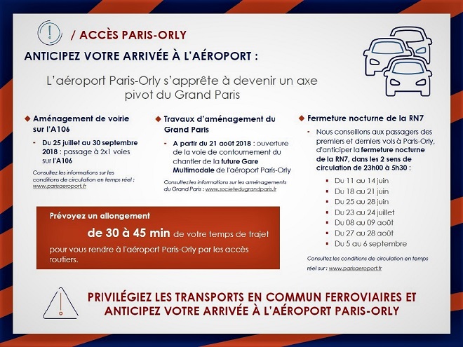 pour accéder à l’aéroport de Paris-Orly (Hall 1 du Terminal Ouest), Attention, les travaux de l’extérieur, qui perdurent, rallongent le trajet par route de 30 à 45 minutes