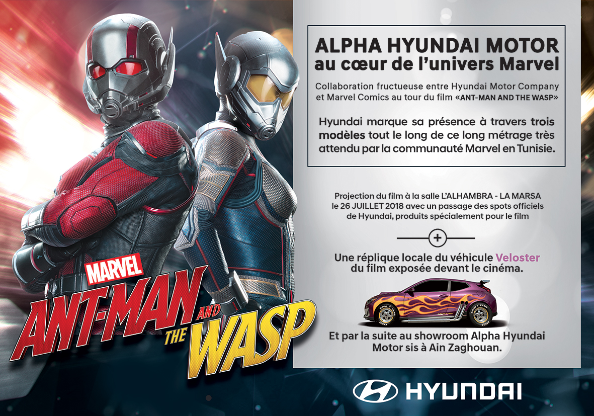 Tunisie-Tribune – Alpha Hyundai Motor, distributeur officiel de la firme automobile sud-coréenne Hyundai en Tunisie pour les véhicules particuliers, célèbre l’arrivée du film«Ant-Man and the Wasp»dans les salles tunisiennes. Le film, qui vient de sortir dans le monde entier, marque la présence de Hyundai à travers trois modèles tout le long de ce long métrage très attendu par la communauté Marvel en Tunisie.
