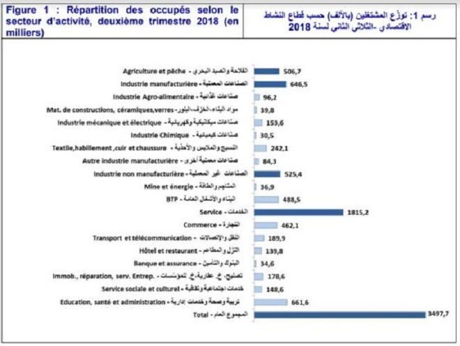 Au deuxième trimestre 2018, le nombre des occupés s’établit à 3,497 millions contre 3,492 millions au premier trimestre de la même année, soit une augmentation de 5,8 milles. Cette population se répartit en 2,577 millions d’hommes et 920 milles femmes. Ce qui représente respectivement 73,7% et 26,3% de la population occupée.