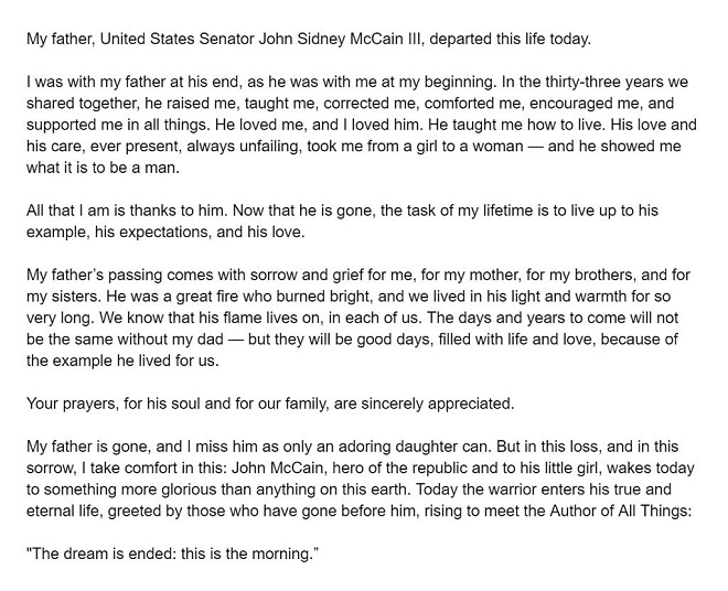 « Le sénateur John Sidney McCain III est mort à 16h48 le 25 août 2018. Près du sénateur se trouvaient quand il est décédé son épouse Cindy et leur famille », a indiqué le bureau du sénateur républicain dans un communiqué.