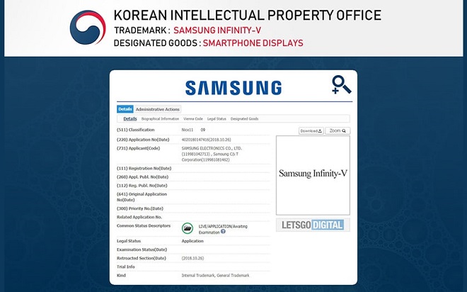 Néanmoins, le dépôt de marque ne révèle aucune des caractéristiques des écrans Infinity-V. Il pourrait tout aussi bien s’agir du nom choisi par Samsung pour l’écran pliable du Galaxy X. Nous serons fixé dès le 7 novembre 2018, date de présentation officielle du smartphone pliable.