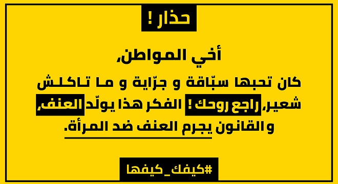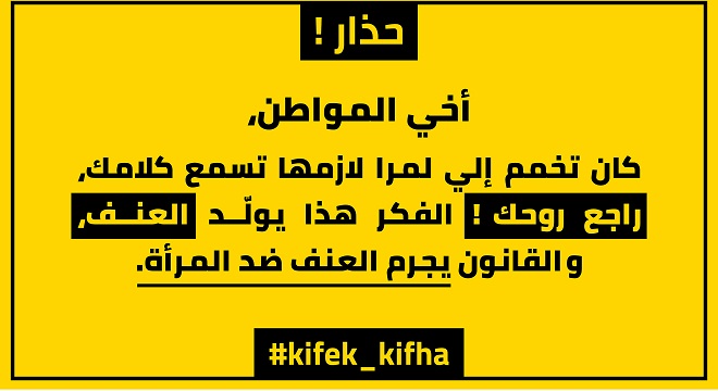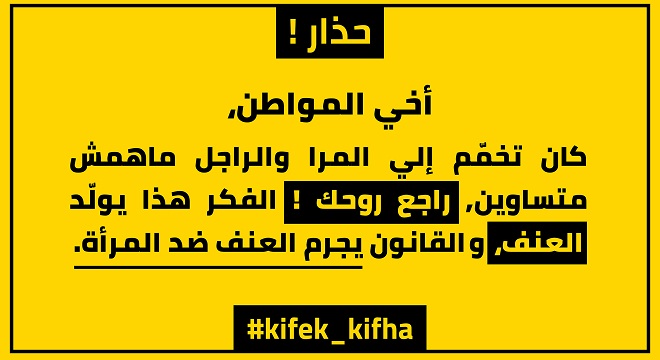 Pour ancrer ces messages et transformer les représentations sociales, la campagne #Kifek_Kifhaa été lancée dimanche 25 novembreà l’occasion des 16 joursd’activismes pour la lutte contre les violencesfaites aux femmes. Elle inclut une campagne de prévention en affichage, via des messages radio et les réseaux sociaux.
