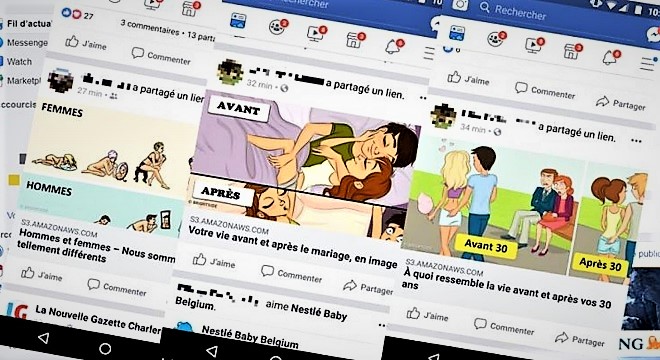Ces publications utilisent un titre fédérateur du genre : « A quoi ressemble la vie avant et après vos 30 ans » ou bien encore : « Hommes et femmes, nous sommes tellement différents ». Ces images piégées n’ont rien de coquin mais donnent terriblement envie de cliquer pour en savoir davantage. Et c’est là que le piège commence à se refermer.