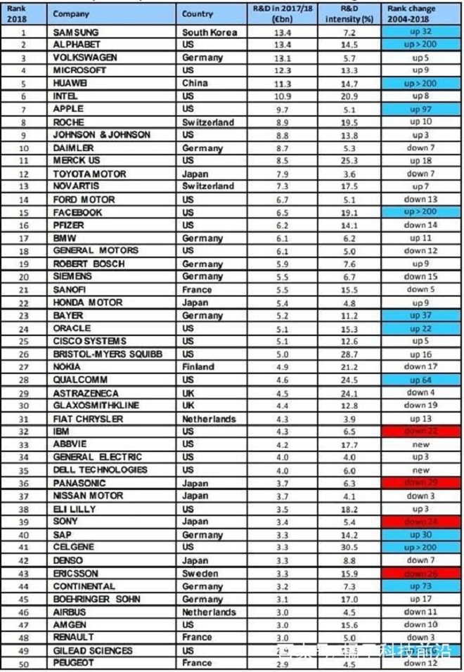 Selon ce classement, Samsung, Alphabet, Volkswagen, Microsoft, Huawei, Intel, Apple, Roche, Johnson & Johnson et Daimler faisaient partie des 10 premières entreprises du classement. Parmi ceux-ci le géant chinois, Huawei, qui s’est classée cinquième, avec 11,33 milliards d’euros dépensés en recherche et développement (12 milliards USD) en 2018.