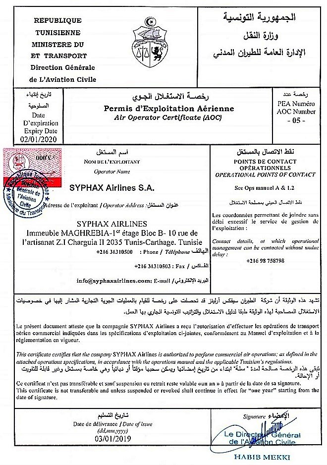 Le certificat a été délivré le 3 janvier 2019 et est signé par Habib Mekki, Directeur Général de l’Aviation Civile au Ministère. Il autorise ainsi Syphax à «effectuer des opérations aériennes commerciales».