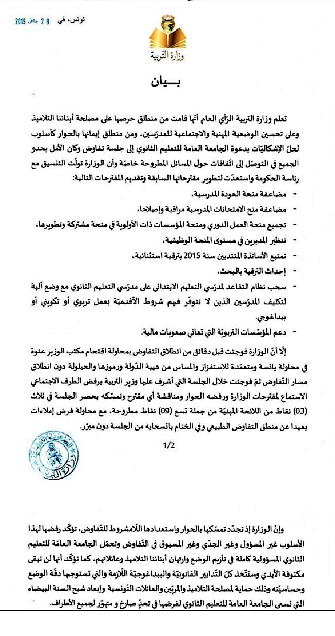Le ministère de l’Éducation, après l’échec de la session de négociation du lundi 28 janvier 2019, avec le syndicat de l’enseignement secondaire, a déclaré qu’il avait fait de nouvelles propositions « dans l’intérêt des étudiants et pour l’amélioration du statut professionnel des enseignants « .
