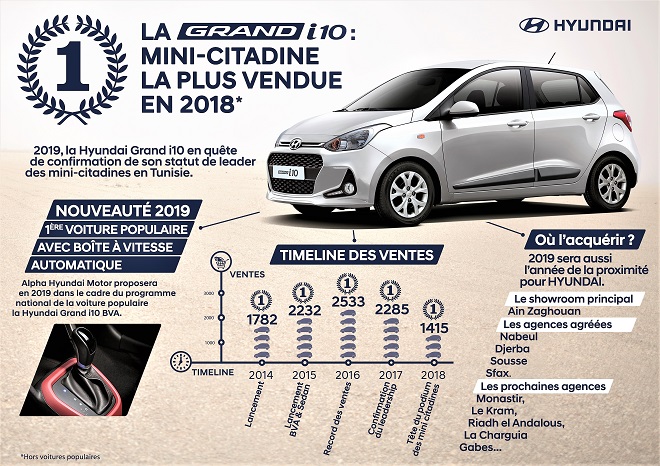 Tunisie-Tribune (Hyundai Grand i10, la mini-citadine) – Après une année confirmant sa place parmi les marques les plus vendues en Tunisie, Alpha Hyundai Motor, distributeur officiel de Hyundai en Tunisie pour les véhicules particuliers, démarre l’année 2019 avec une première sur le marché local.