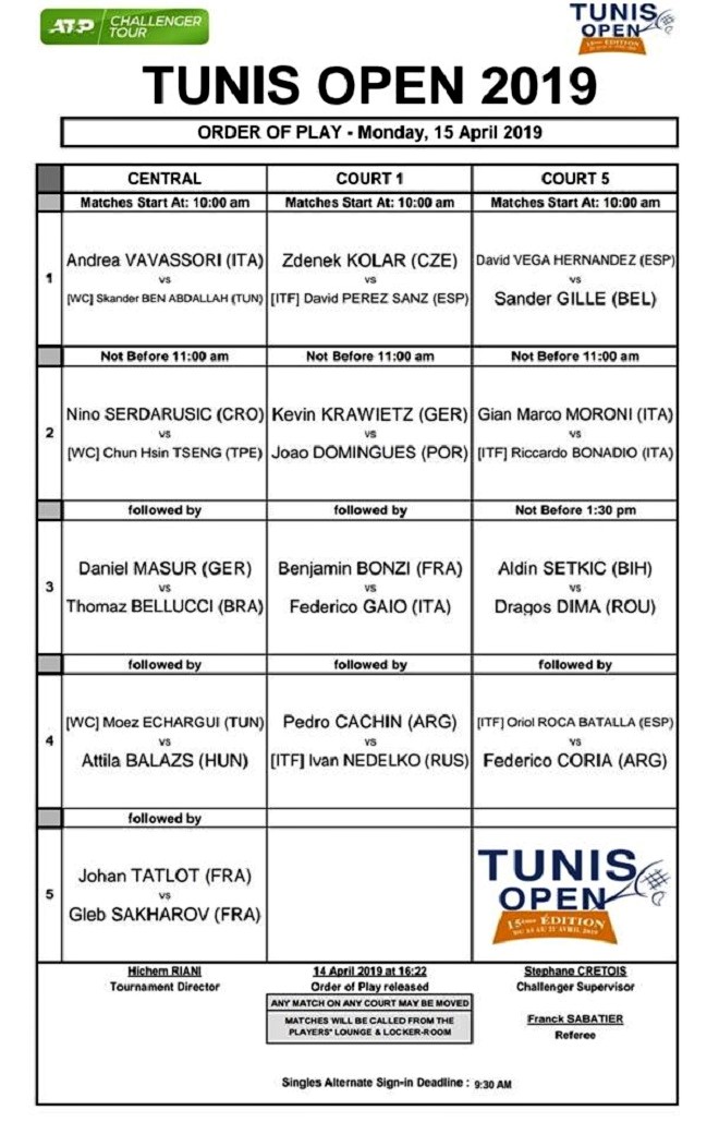Suite aux différentes et prestigieuses inscriptions et à l’absence surprise de Malek Jaziri dont l’inscription a été acceptée en dernière minute, au fameux tournoi international de Monte-Carl)o (qui se joue au cours de la même semaine, le tirage au sort effectué au Tennis Club de Tunis (TCT), samedi 13 avril 2019, a donné à l’affiche du Tunis Open 2019, les grandes figures suivantes :