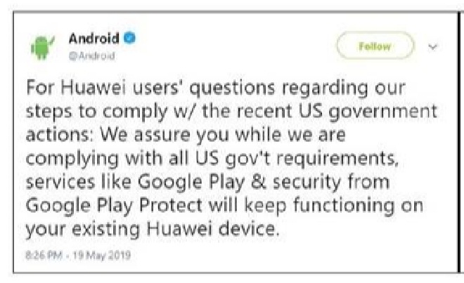 Tunisie-Tribune (Android et Huawei) – Après la décision catastrophique de Donald TRUMP de placer Huawei sur la liste noire et bannir toutes possibilités de business entre le groupe chinois et les entreprises américaines, Android a rassuré les utilisateurs des smartphones Android Huawei, en confirmant que ses services tels que Google Play et sécurité continueront de fonctionner sur les appareils Huawei existants.