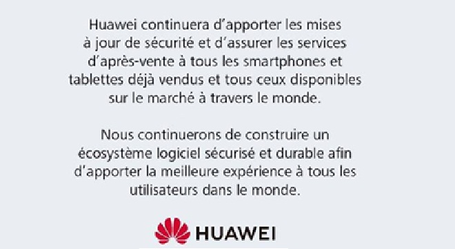 De ça par le géant chinois a publié hier sa réponse officielle en affirmant que Huawei continuera d’apporter les mises à jour de sécurité et d’assurer les services après-ventes à tous les smartphones et tablettes déjà vendues et tous ceux disponibles sur le marché à travers le monde.