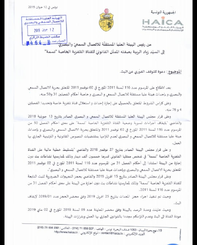 La HAICA interrompt la diffusion des programmes de la chaîne Nessma Tv