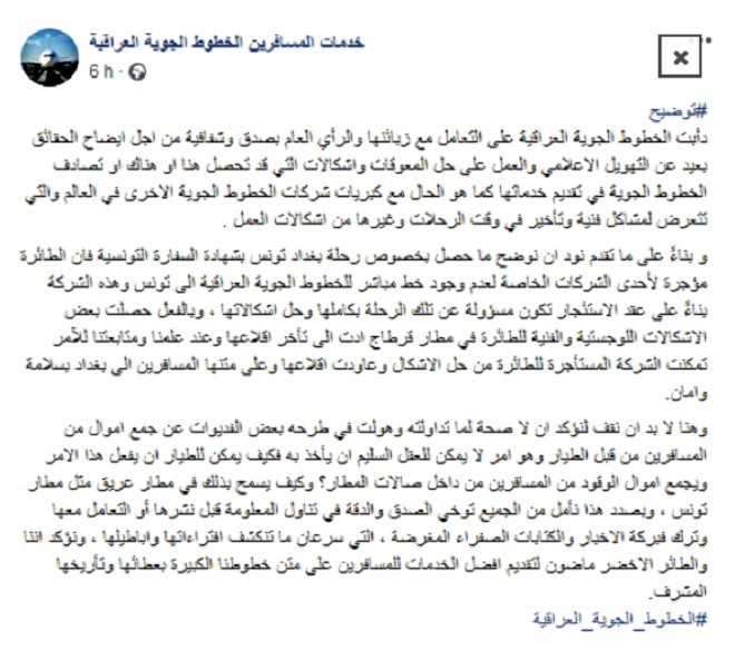 En voulant se disculper, la même compagnie irakienne s’est exprimée via sa page Facebook, ce lundi 29 juillet 2019, a mis les torts sur tout le monde (sauf sur elle-même) et a même tapé sur la presse tunisienne, et ce, en essayant de clarifier la situation.