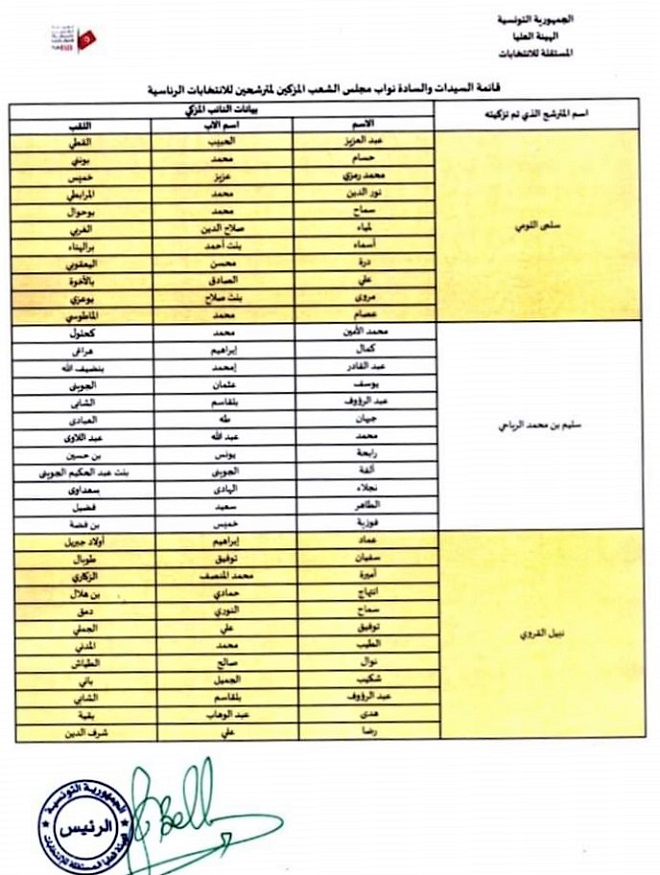 Tunisie-Tribune (parrainages des candidats) – l’Instance supérieure indépendante pour les élections (ISIE) a publié, ce samedi 17 août 2019, une liste nominative (que nous publions ci-après) des députés ayant parrainé les candidats aux élections présidentielles anticipées qui aura lieu le 15 septembre prochain.