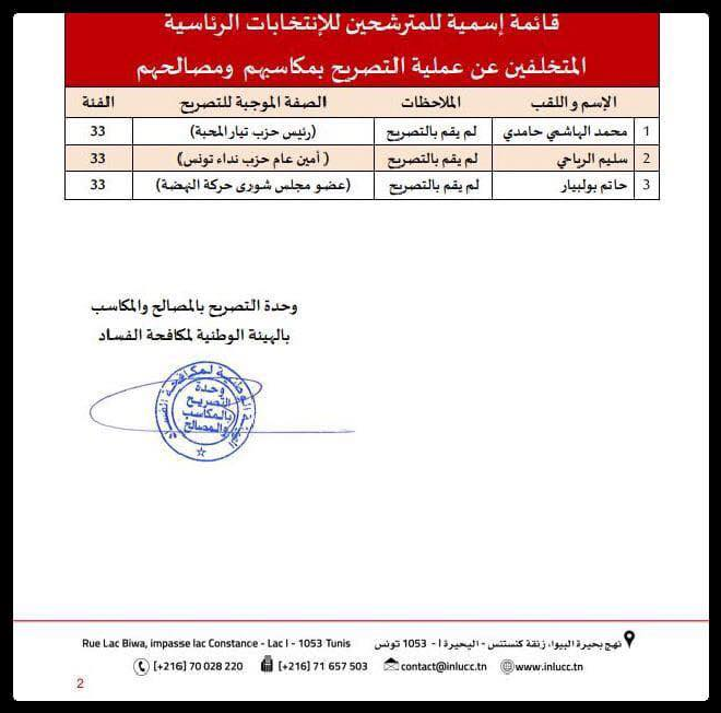 Tunisie-Tribune (candidats à la présidentielle) – Selon une liste publiée par l’Instance Nationale de Lutte Contre la Corruption (INLUCC), trois parmi les candidats à la présidentielle n’ont pas déclaré leurs patrimoine.
